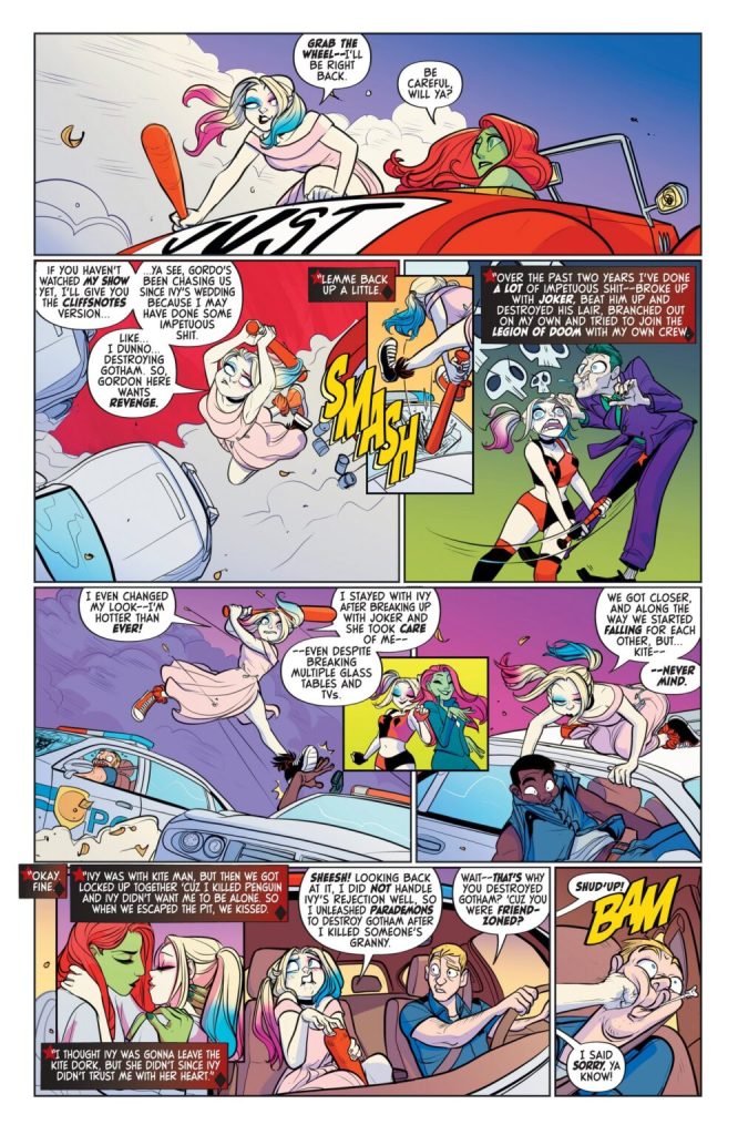 From its first page, The Eat, Bang! Kill Tour is season two-and-a-half of the Harley Quinn animated series. We’re starting right at the car chase between Harley Quinn and Poison Ivy and Commissioner Gordon and the entire Gotham City Police Department the second season ended on and immediately into the fallout from Poison Ivy and Kite-Man’s botched wedding. Even if this is a Harley Quinn series, this is a story about Poison Ivy and everything that has been mentally following her throughout the animated series. We see the doubts, regrets, and ultimate acceptance of herself all the while her and Harley drive from Gotham to Blüdhaven to Detroit and annoy any hero or villain in their vicinity. And while Gordon tries to drag them back to Gothamn.