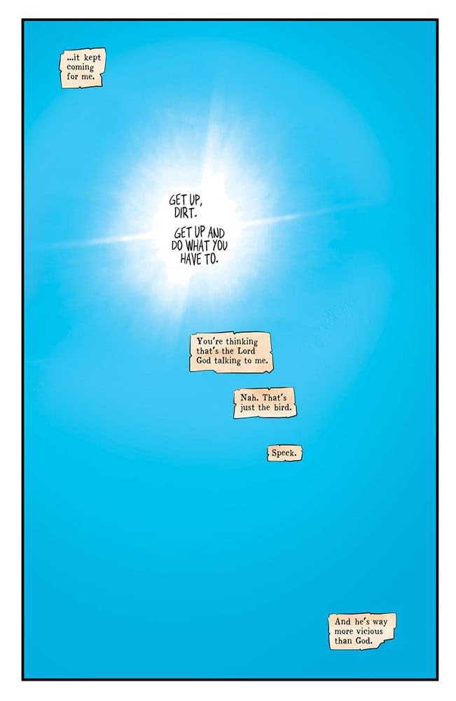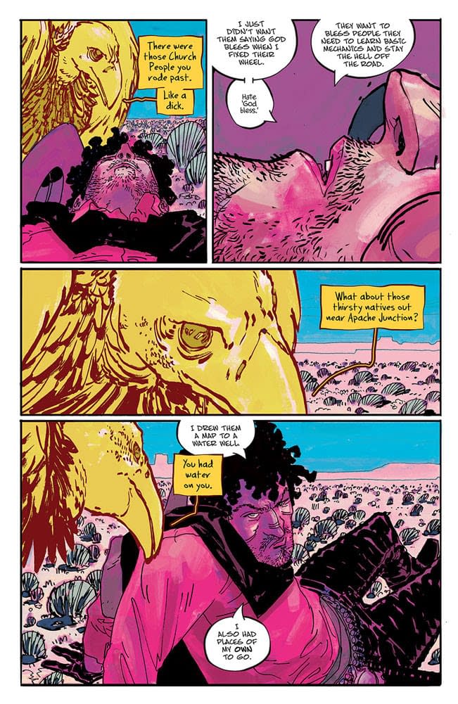 And from its first page, Above Snakes is looking at weirder horizons. Told in journal entries and narration by traveling snake oil salesman, Dr. Tomb, we have our main character, Dirt, and his quest for revenge against the titular gang that terrorizes this slice of the desert. But Dirt isn’t alone in his endeavors as he’s continually followed and pestered by Speck, a golden vulture that reminds him of all the good he could do while pointing him in the direction of members of the Above Snakes gang that killed Dirt’s wife. And in this first issue, he’s pointed toward the town of Lazarus and a man named Cobber. Cobber was there when Dorthea died and is currently dragging most of the women in Lazarus to work in his brothel. And then the violence happens.