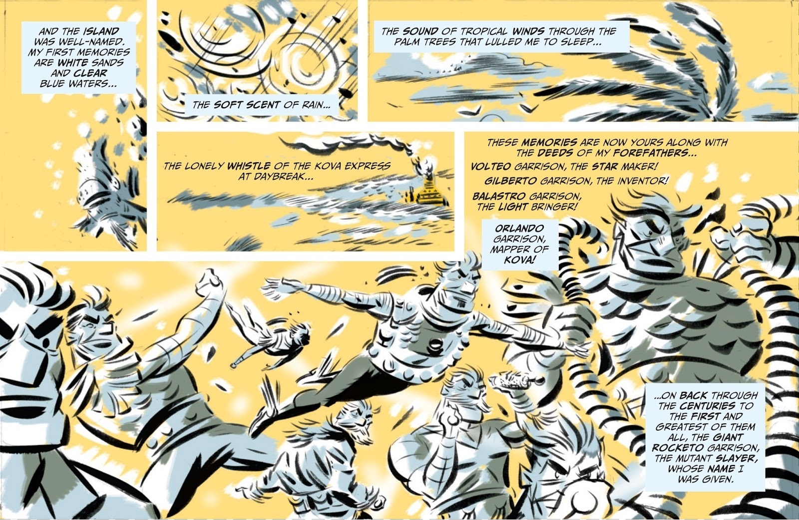 Rocketo is the story of the titular Rocketo Garrison and his adventures as a Mapper in a shattered world not unlike our own. After an alien attack that nearly wiped out all life on Earth, the remnants created new species of people that could thrive and rebuild: earth men, bird men, fish men, and the Mappers. Those Mappers would help navigate the new oceans that had opened up between devastated continents and help rebuild. Rocketo was one of those Mappers before a great war left his mapping abilities dulled to the point of uselessness. But he can still read a map and that’s all that’s needed to help navigate the Hidden Sea that has swallowed all who had dared venture into its deadly waves. It is, of course, pure pulp via 2006 with Espinosa’s kinetic art that brings to mind the best concept art for an adventure film that would never be produced.