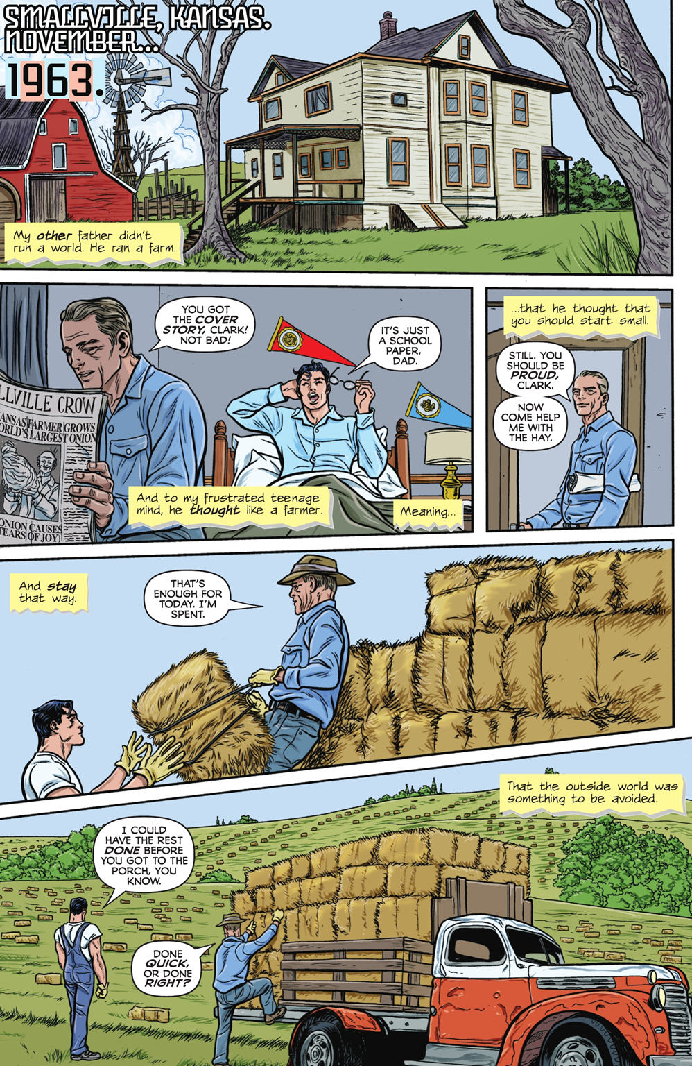 Superman: Space Age takes us back to the 60s, of Clark Kent working on the farm in Smallville with Pa and Ma Kent as the threat of the Cold War continually looms. It’s a restless kind of Clark that wants to do something good. But he doesn’t yet know what that is yet as a brash action of his nearly causes the US and USSR to launch their nukes. And it’s here, on the precipice of accidentally fucking up the planet, that he begins his time with his other father, Jor-El, in the form of a hologram in the recently discovered Fortress of Solitude. We’re given a different interpretation then of how Clark became Superman. If the Kents were able to give him the moral compass that would point him toward good, then it’s Jor-El that gives him the tools for that goodness.