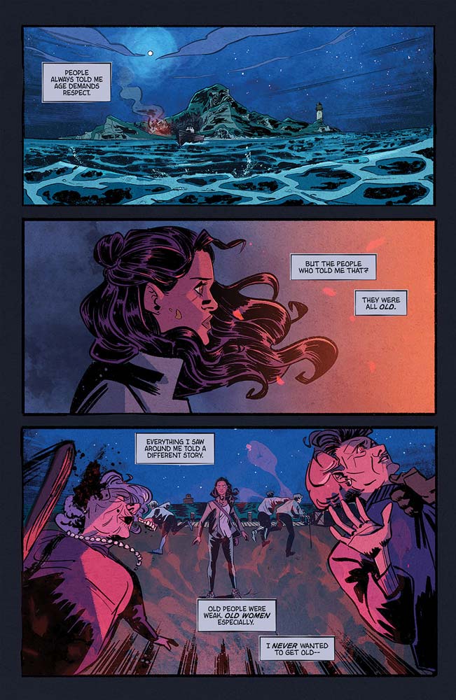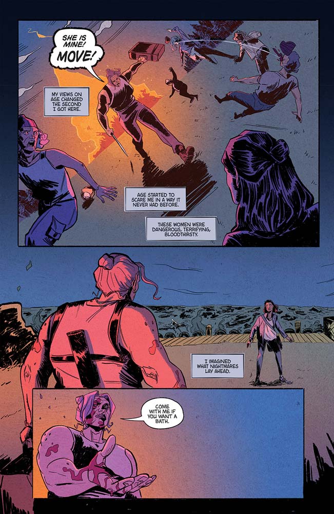 Although we don’t know why the murder is occurring just yet, The Island is still resplendent with violence. From the first splash page we’re presented with grandmas wholesale murdering one another for unknown reasons. But then that’s where we meet Jay and Rosie. Jay is very much not a grandmother and Rosie is larger than a sedan and swinging an ax at anyone that gets close enough. But Rosie grabs Jay and takes her back to a lighthouse hideout with Lottie and Caroline—a pair that have been on the island for an unknown amount of time, but are still somehow making a small living among the violence. All of this violence, however, still catches up to them.