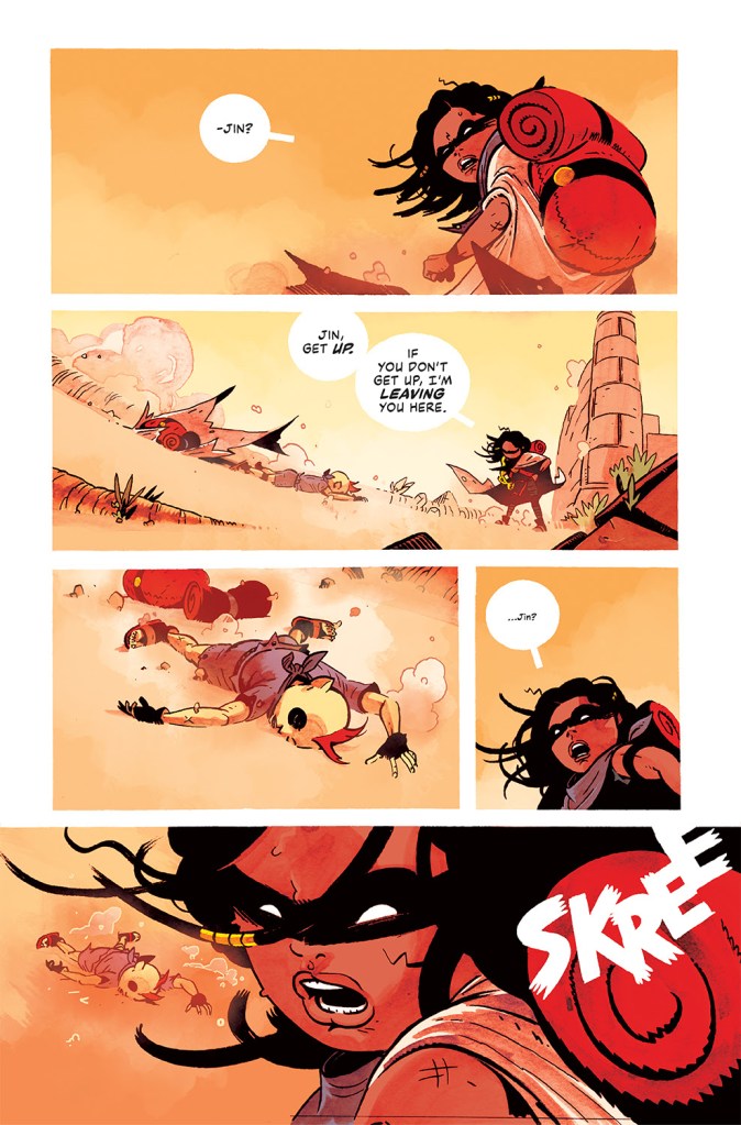 Kaya and her brother, Jin, a prince who no longer has a kingdom, are wandering. It’s been some time since they were able to escape the destruction of their village, but the wasteland they wander in is vast. They have to keep journeying northward to reach some kind of safety, despite Jin’s protests that his princely status imbues him with authority over where they travel. Kaya is, of course, doing her best, but when the pair are overrun by lizard riders in the husk of another destroyed village, she must reveal the magical arm that will keep them both safe from the wilds of their world. Luckily for them both, Kaya knows one of the riders and finds brief safety in their camp, but precious little food or comfort for the rest of their journey.