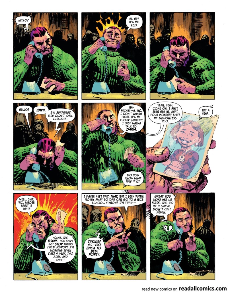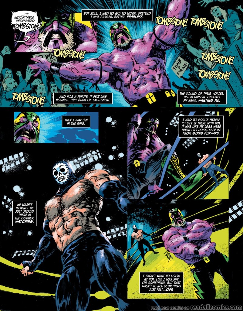 The back of this one-shot asks if wrestling noir is a genre or not. While many of the out-of-ring controversies, rumors, and scandals could fit into that category, Hell is a Squared Circle is one of the first comics that captures that same mood as noir. Mood is dominant throughout the story. Even with this larger format—the comic is in that larger prestige format many of DC’s Black Label books also use—it still feels like the panels are closing in more and more as the story goes on. After long enough running through the independent wrestling circuits in Canada, he thinks he’s in the clear. But a PI appears one day before a match. The panels squeeze in on Walsh until his opponent takes off their mask to reveal the past he’d been running from for so long.