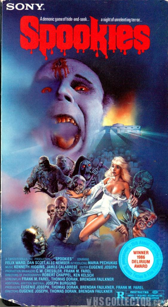 Come to think of it, I’ve never covered 1986’s Spookies on this blog. This movie credits not one, not two, but three directors: Brendan Faulkner, Thomas Doran, and Eugenie Joseph. I remember watching this on the USA Network as a child one Saturday afternoon. At that point in my life, it was the worst movie I had ever seen. Spookies was my first introduction for what I would later come to know as schlock.
