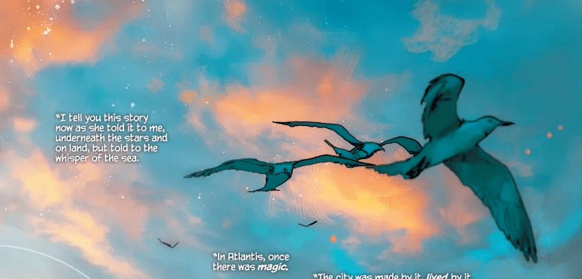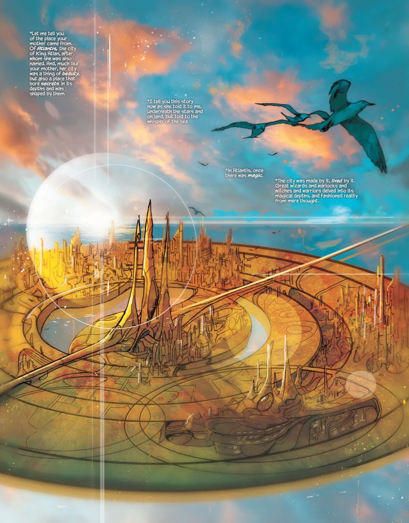 Last year, I broke down the general plot of the first issue and what has happened in the proceeding two turns much of that information on its head. There was no kraken attacking other ships in the ocean, at least not really. What we begin to learn from the unfolding narrative is that the thing that had fallen into the ocean from space wasn’t falling, but returning. The heart of this vessel was a prison for a magical force that powered Atlantis for centuries by manifesting their latent dreams. It manifested nightmares as well—the city sinking being the most common nightmare among Atlanteans. The kraken, the crew’s fighting, and maybe even the presence of Black Manta, were all brought to life through this magical core and its desire to be free.