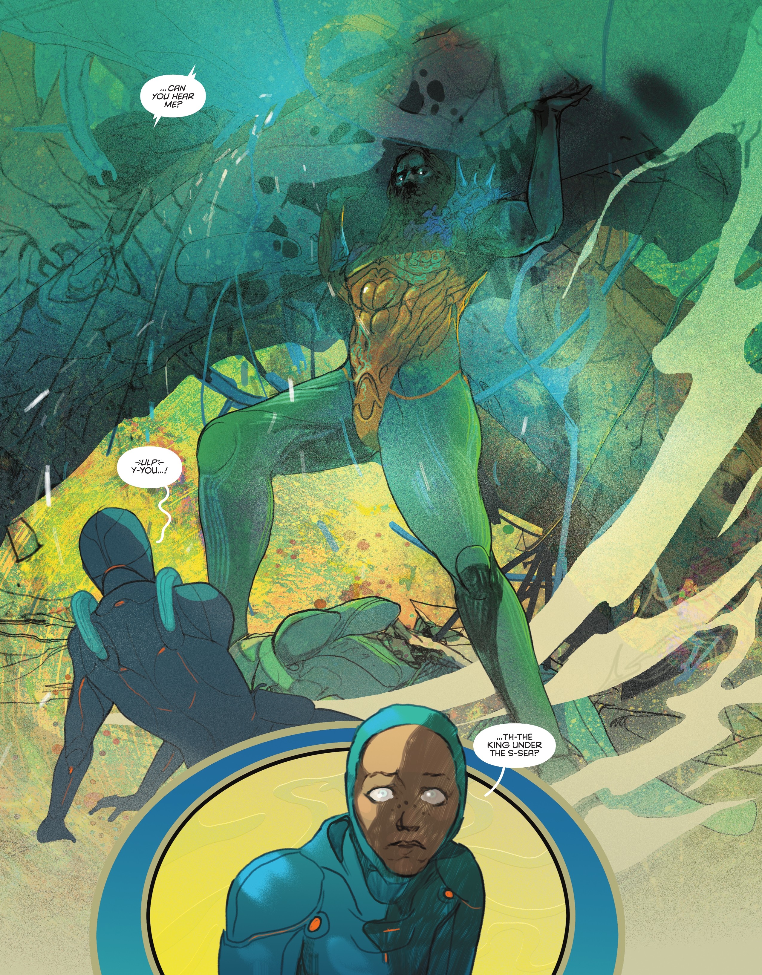 Aquaman isn’t simply the character we’ve been following, but this legend—the King Under the Sea. What V, Ward, and Bidikar are exploring with this series is the idea of how regular people can perceive these heroes. They’ve become mythic figures in the world and those that are lucky enough to view them perpetuate those stories and myths. While some are more tangible and immediately visible, others may not be. How often does someone ever get to see Aquaman? How often do they see what he does so deep in the sea? For most people, he’s likely become a figure of legend not often talked about except by sailors. But he’s real, fully flesh and blood, and grappling with his own legend—more literally than he would like.