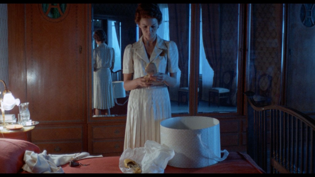Alice gets strange phone calls at the hotel, finds more clues like an abandoned red wig, and has a romantic interlude with a handsome man with a transatlantic accent. She also keeps dreaming about the astronauts on the moon. This giallo movie is just plain weird. You get a grisly death at the end, but I can’t say I was any less confused when the movie was over.
