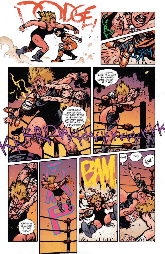 Wrestling is a weird storytelling medium. Most people who watch go from ardent believers of the violence happening in the ring—to the point where many a sibling’s broken bone can be attributed to a swanton bomb off the top bunk—to realizing the artifice when seeing a man having to wrestle his boss in tag team match where his partner is God. But one thing that unites them all is the spectacle—the lights, the tights, the violence, and the feats of strength. With Daniel Warren Johnson, Mike Spicer, and Rus Wooton’s Do A Powerbomb, we have all of that spectacle and more.