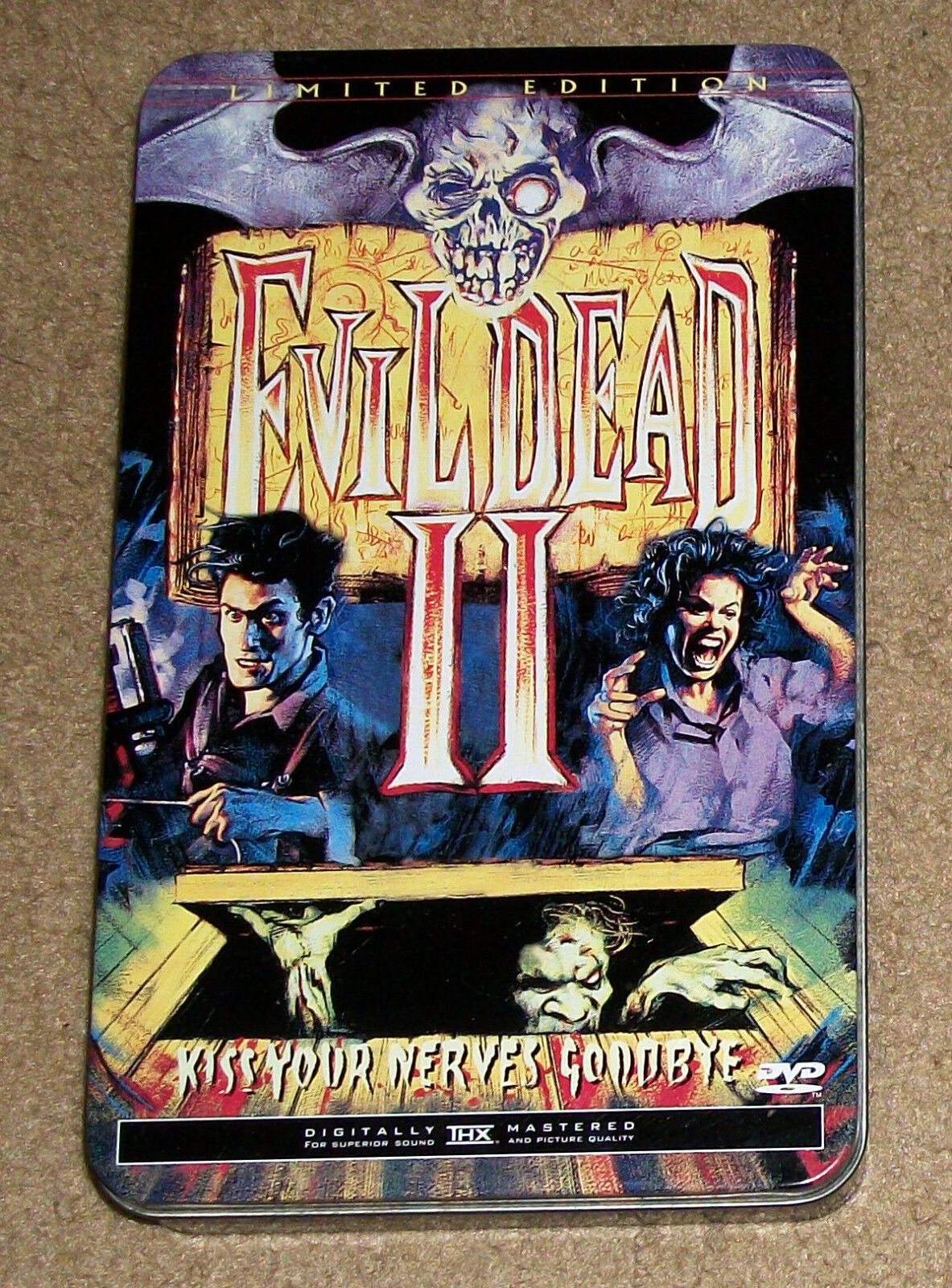 Next came the Evil Dead II Special Edition from Anchor Bay. I bought the special collector’s tin for this one. I think it came with a collector’s booklet and a postcard. It was the little things back then that made DVD collecting worthwhile. Next up was Anchor Bay’s own re-release of the original Evil Dead. This was a new widescreen edition of the movie that came housed in a replica of the Book of the Dead. The front and back cover was a rubber effigy of a human face. It was said if you stuck it in a freezer, the surface of the book would feel like real human skin.