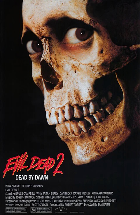 Tonight’s movie is 1987’s Evil Dead II from director Sam Raimi. I don’t know if after four hundred and thirty-four film blogs if I’m worthy to discuss this.cinematic masterpiece. It serves as both a sequel and a remake to the original Evil Dead. If that doesn’t make sense to you, I’ll try to explain. Yes, the movie starts out with Ash Williams driving up to a cabin in the woods with his girlfriend, Linda. Yes, he plays the professor’s tape that summons the ancient demons that possess his girlfriend. And yes, Ash decapitates Linda with a shovel and buries her corpse.