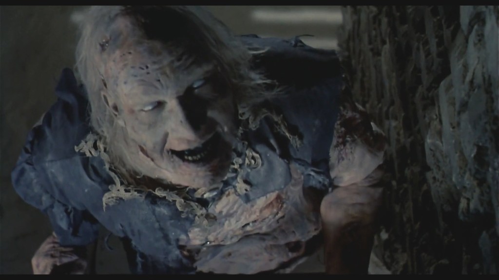 Meanwhile, a researcher named Annie arrives to give her father the lost pages of the Book of the Dead. She is joined by her partner, Ed, and they drive up to the cabin only to discover that the bridge is out. A hillbilly named Jake and his tobacco spitting girlfriend, Bobby Jo, offer to take them up to the cabin by other means. When they arrive, they think Ash is a maniac and lock him in the cellar. Annie plays her father’s recording where he states the only way to destroy the possessed is through bodily dismemberment. But the old professor didn’t have the heart to dismember his wife. He buried her in the earthen floor of the fruit cellar. And then she rises from the grave to maul Ash and steal his soul.