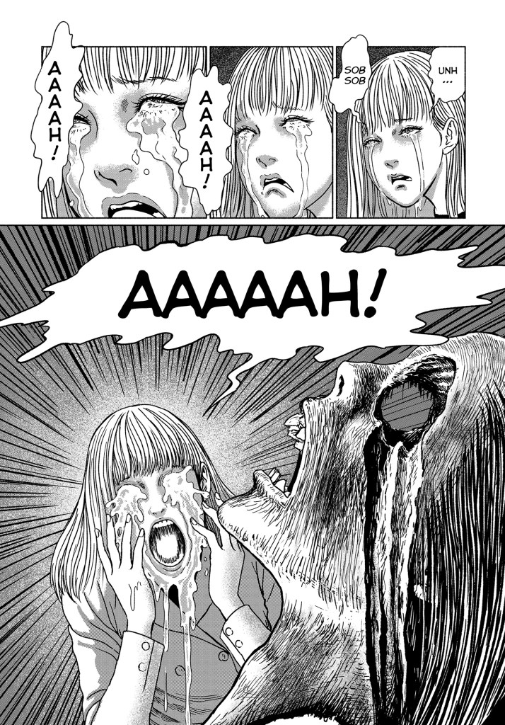 All of these stories take place in more transitory areas in life: a street, a school, a forest, and an alley. But what Ito does with each is zoom in further into the uncanny of being in those spaces as the characters deal with crying corpses, people being turned to pillars of salt, spirits erupting in a flow from a dragon’s cave, and the broadcast dreams of a serial killer. All of his characters are caught between the real world and the sensation that they’re being pulled into something unreal.