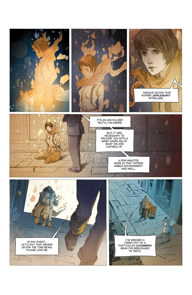 Humanity can traverse different dimensions through a doorway known only as The Bridge. Two cartographers are sent across The Bridge into the unknown. As is expected in a story like this, they disappear. One, Elena, is confronted with a machine-man in a suit after being teleported from a frozen wasteland. While he’s genial, there’s an edge of menace to him. The other cartographer, Jacob, is alive. But just barely. Hung in a suspended state, he exists in the basement of a little suburban neighborhood that looks like it’s being built right in front of us. No one can see where Elena or Jacob are after they crossed The Bridge—except for their daughter, Adley.