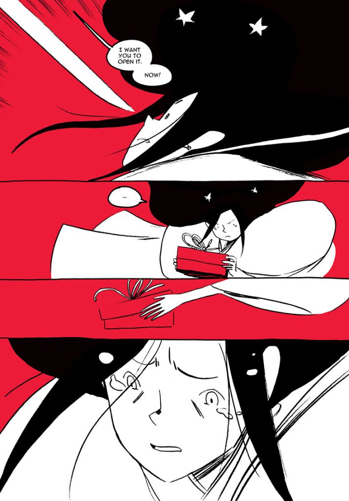 Niimura’s eye offers expansion with his interpretations. While he does break down the basics of these tales—the portions most familiar to readers of Japanese folktales or Decemberists fans—he works to give us another dimension to them entirely. In “Never Open It,” the young man, Taro, meets an older man who was also given the box from the undersea palace. This man opened it and was transformed into the old man we would have been left with had Niimura strictly followed the original story. But he instead tilts the perspective. We get to see the consequences of the original story’s actions while being given the opportunity to get revenge for a trick played on curious. Similar in “The Promise” in how Yohio isn’t the one to witness the woman transforming into a crane to weave her cloth, but still must deal with the consequences of someone else’s actions that doom their entire town.