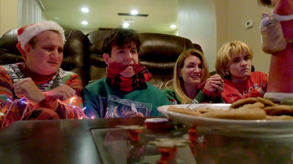 The movie begins with some home movie footage of a middle American family’s Christmas celebration. A man named Geoff shows up at the door, saying that his car broke down and if he could use their phone since his cell is also out of juice. The dorky dad lets him inside and tells him they were planning to watch a Christmas movie. It’s not long before a gun comes out, the family is tied up with Christmas lights, and Geoff has a captive audience for a bunch of VHS tapes he brought with him.