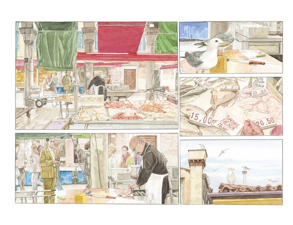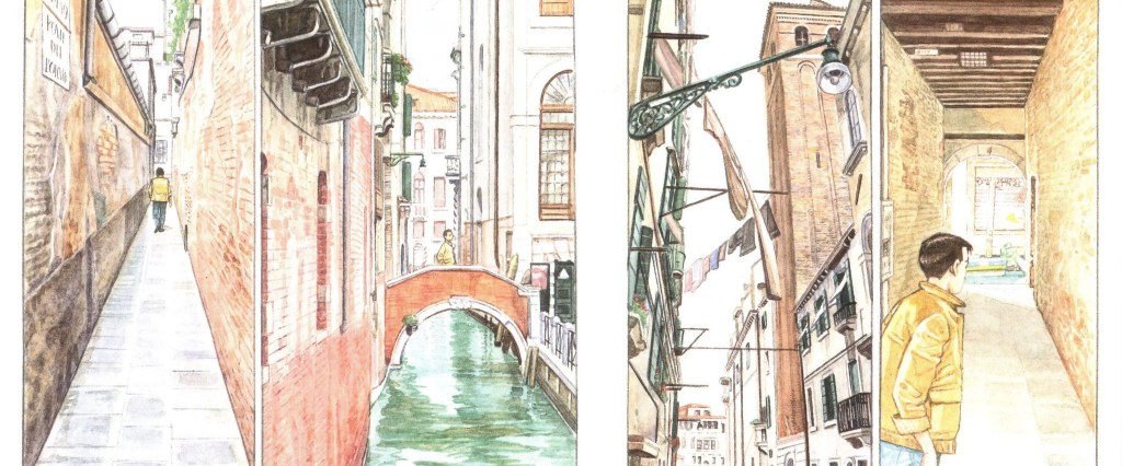 Venice is one of the quietest graphic novels I’ve read. It’s methodical in its approach—the sparseness of captions and lack of dialogue compel you to stop and take in each page and panel as if you were traveling with Taniguchi himself. He wants you to sit and observe, to breathe in the space within the city, and feel through visuals only the experience of stepping through Venice. With only the momentum of a stroll, you are immersed into the moment.