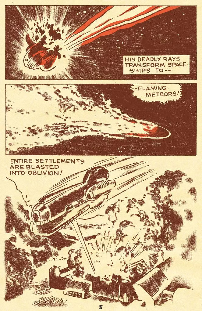 Crash Comics Adventures was published by Tem Comics in the early 40s and lasted for only five issues before ending. It was a comics magazine of the time filled with short serials much like Action and Detective Comics. Filled with superheroes, adventure, and intrigue, Crash Comics also contained a five page space story told by a 22 year-old who signed with his pen name for the first time: Jack Kirby. His first story of Adam Starr is what we would come to know of space adventure stories—space pirates terrorizing the solar system, valiant heroes hunting them down, and terrifying aliens that must be dealt with by any force necessary. But in the vast, sweeping emptiness of space, we can see the first percolation of the kind of cosmic-scale stories Kirby would eventually come to define in the medium.