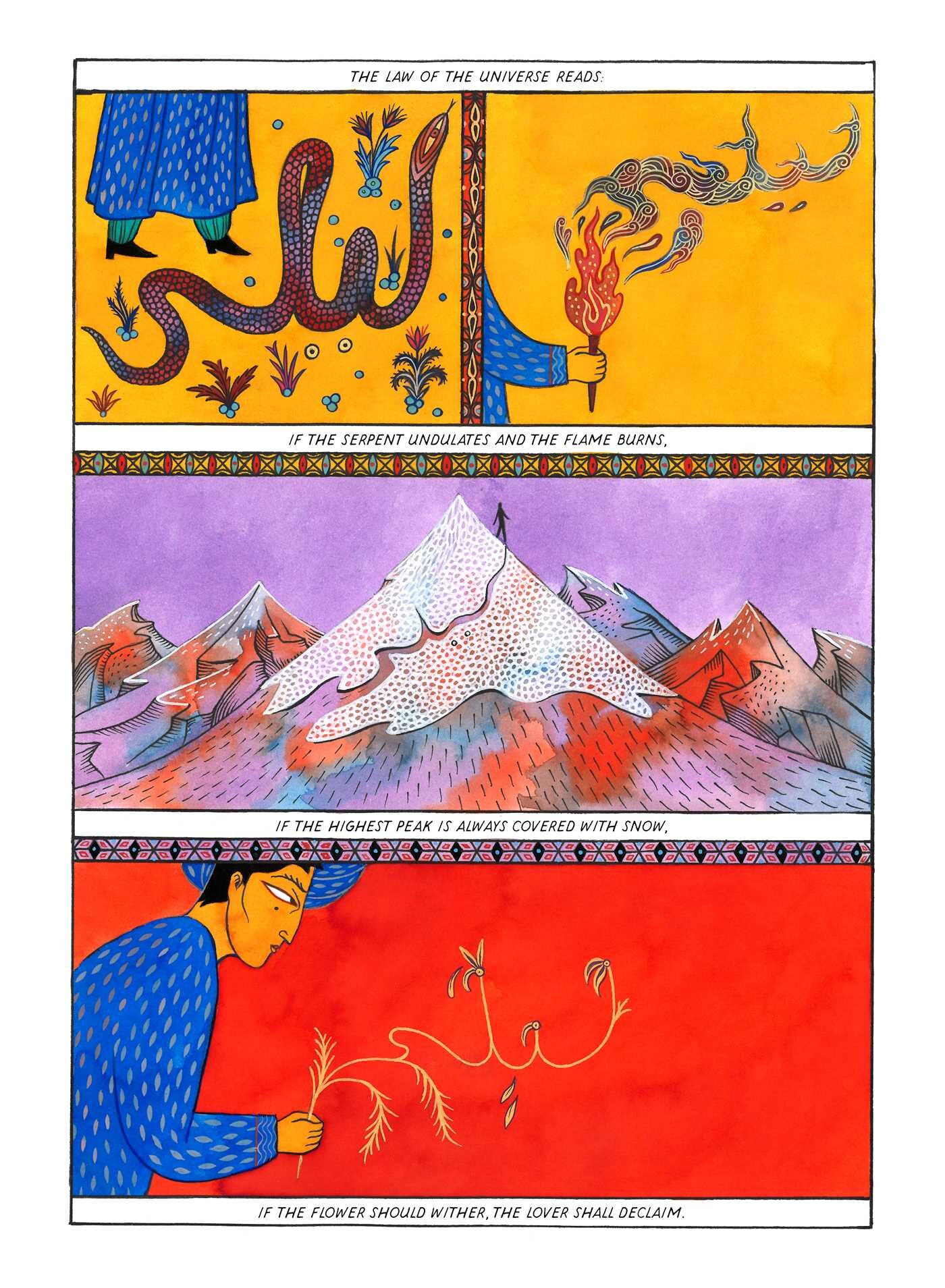 Comics have a particular strength when it comes to poetry. The quickness of the panels being able to render different interpretations of a single line of poetry adds a new kind of depth to the poetic process. These panels themselves end up becoming another aspect of the poem—a line break becomes more of a gulf as the normally blank space is filled with images and color. Nowhere is this usage of panels as line breaks as strong as it is in Majnun and Layla: Songs from Beyond the Grave by Yann Damezin in the medium of graphic poetry.