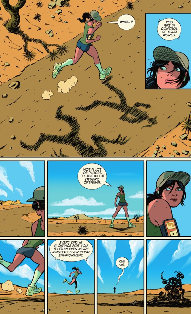 As I mentioned last month with Tamaki’s characterization of Wonder Woman, as an author, she has this deftness to her character writing that feels definitive. Zatanna as a character is someone who has some consistent aspects in terms of appearance and ability, but her personality can go in a few different directions depending on the creators working with her. In this first issue, we’re getting more history and personality in a few panels that gives us a character that feels familiar to our past experiences—I still remember my first being the Justice League cartoon—while also giving us a more solid feel. This is a character with the outward confidence of a stage magician, but who listens to self-help podcasts while on a run. She’s rooted to her current job and show, but wants to run away from the past that she sees every night. We get more than just a magician, we get a person.