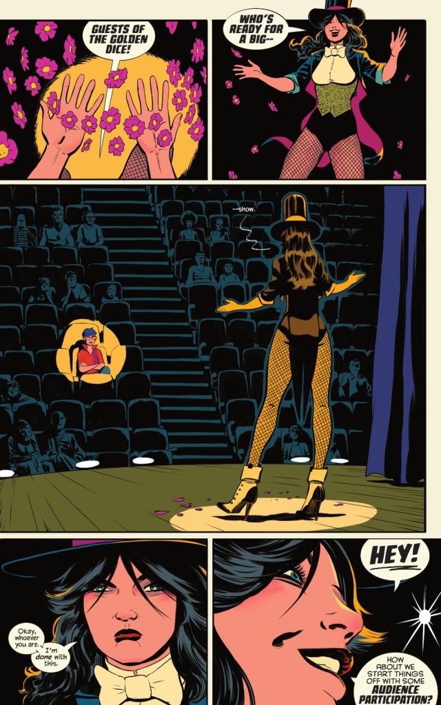 There is no better place for a magician like Zatanna to show off her mastery of the magical arts than Las Vegas. In a small casino hotel. With free admission. I mean, at least it pays the bills. But after enough supeheroics to fill up a dozen other series, maybe it’s time for Zatanna to simply relax with a small-stakes sort of show for a while. It’s something that can at least provide a distraction from the dreams that keep visiting her every night of her first time using real magic as a child. Or the odd shadows she’s seen while on her morning run. Or the person who has been wearing a dozen different outfits to see her free show every day. But that’s all coincidental. None of it could possibly have anything to do with all of those kids that disappeared from her magic trick or her dad’s death. Or the giant demonic creature peaking out from behind the curtains on her stage.