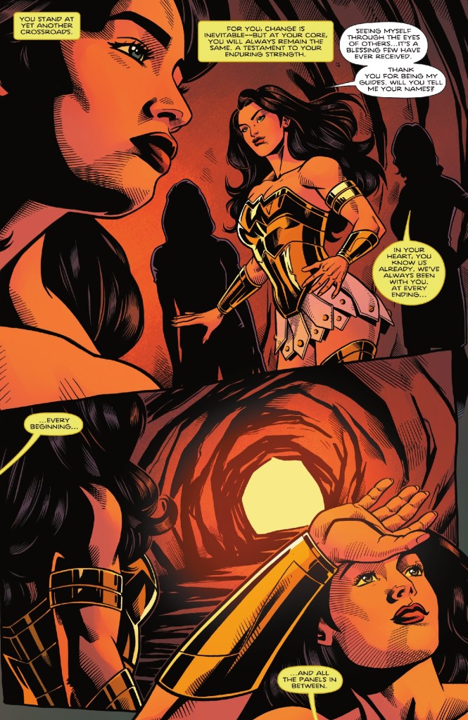 But, of course, Hera can’t succeed and it takes all the powers on Earth and the Rock of Eternity to stop her. This is where the run slows down. Instead of ending things on bombast in the lead-up to Wonder Woman #800, we’re instead treated to something wholly different: a series of dream sequences. Diana has to recover after her fight with Hera and this deep meditation allows her mind to wonder into those of her friends. We see her across the eras as a variety of artists bring us back through history to show just who Wonder Woman was and will become. It feels like an earned ending more than anything—one final rest for this character before a new team takes over—but also the thesis of their entire run. Diana was only ever just one person, but it was everyone around her that helped make her the character that has become so iconic.