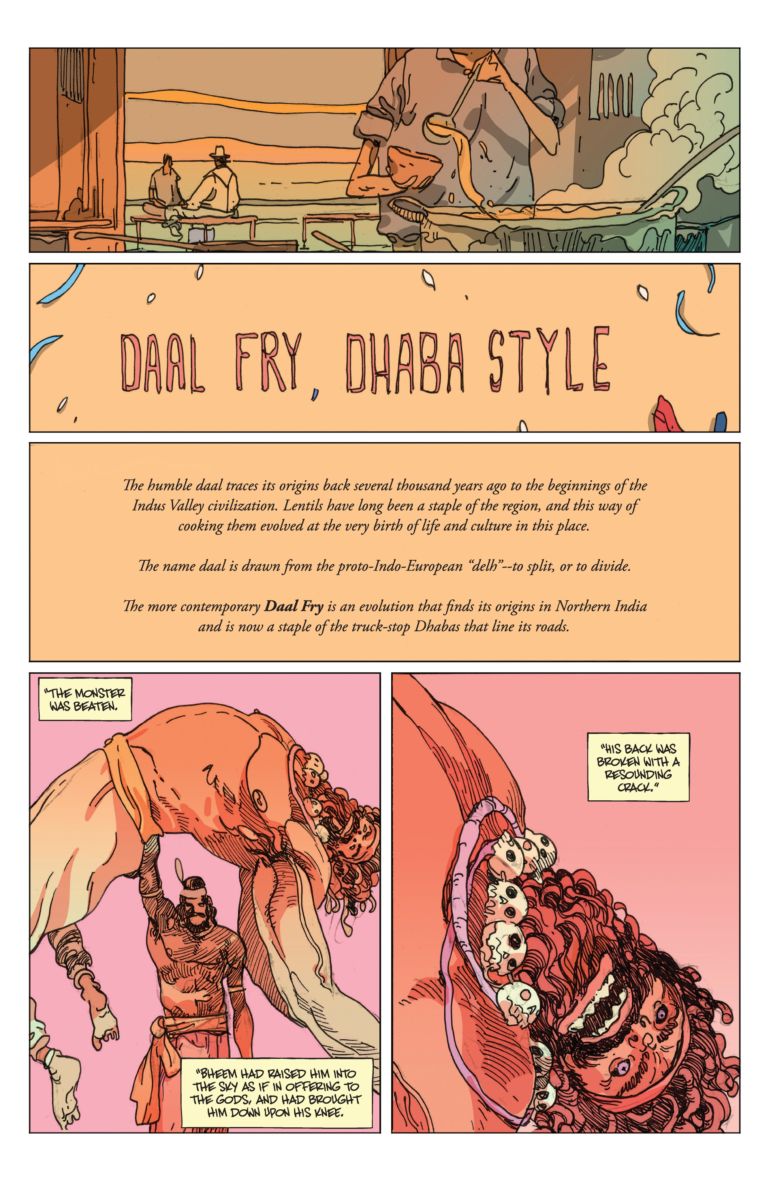 This, though, is a story about stories. And throughout the story we see different sides of Rubin and what people say about him—from the terror depicted in art to the scholar and poet whose stomach was seemingly bottomless to the man-eater who must be put down to the friend that helped a man discover what he was meant to do with food and art in his life. Much like with many of the recipes included throughout these six issues, there are embellishments and different degrees of content added depending on who is doing the telling. There is never one way to make raan just as there’s no one way to tell the story of Rubin or Mohan. What we can trust about these people or the food they’re documenting is simply by judging what is in front of us at the moment, be it enjoying the history of a daal fry or Rubin sharpening his knives over a tied-up vendor.