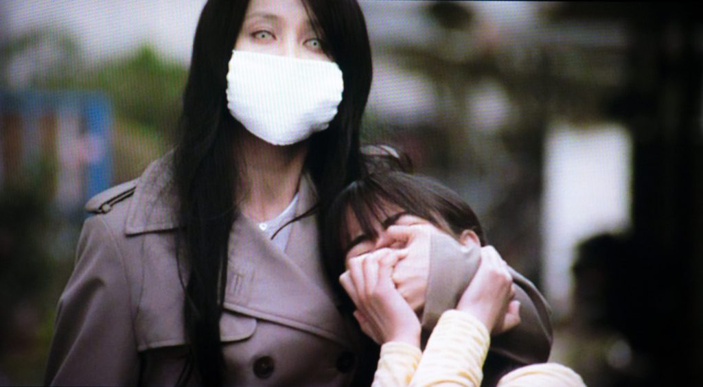 Our two protagonists are two elementary school teachers, Kyōko (Eriko Sato) and Noboru (Haruhiko Kato). Kyōko suspects one her students, a girl named Mika (Rie Kuwana), is being abused by her mother. While walking her home in broad daylight, the Slit-Mouthed Woman appears brandishing pinching shears and wearing a mask. She asks if she’s pretty and removes the mask, showcasing her destroyed cheeks. She snatches up Mika and Kyōko can only sit in fear as the Slit-Mouthed Woman walks away with the girl.
