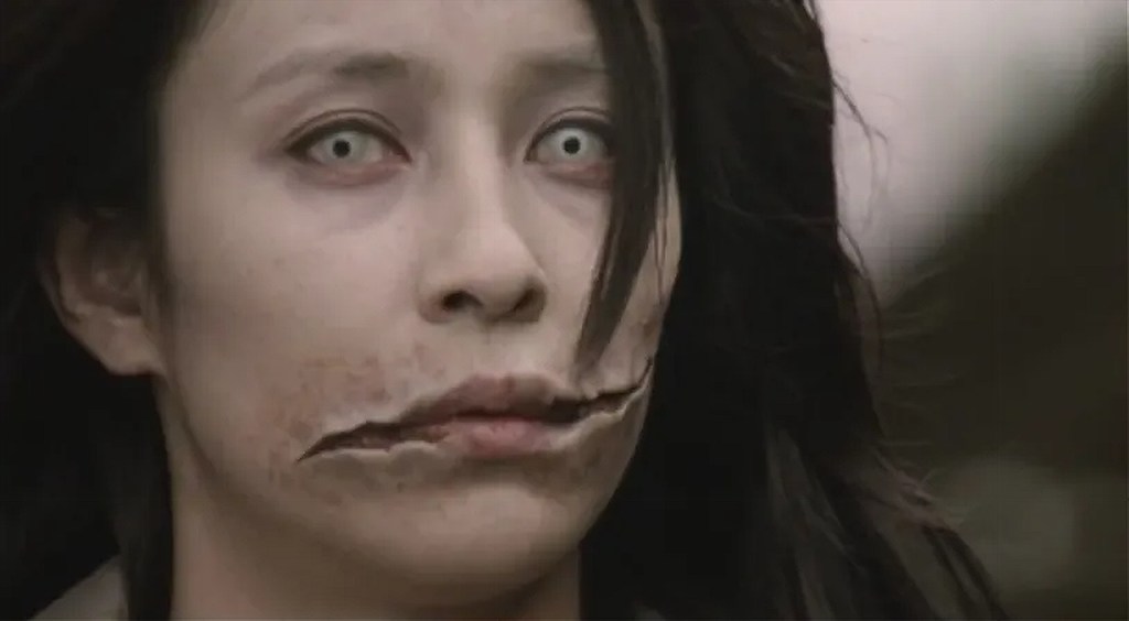 We conclude Japanese Horror Month with 2007’s Carved: The Slit-Mouthed Woman from director Kōji Shiraishi. Apparantly, the Slit-Mouthed Woman is a Japanese legend dating back to the 17th channel. Wearing a mask and brandishing a knife or large shears, she asks her victims of they find her pretty. If they say “Yes,” she removes her mask to reveal a face that’s slice cheek to cheek. If the victims says “Yes,” she slices their faces. If the victims say “Get away from me, you freak,” she kills them.