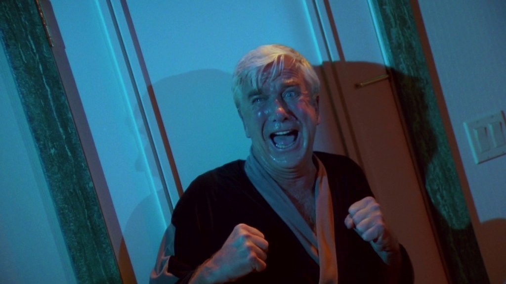 A sadistic Leslie Nielson buried Ted Danson up to the neck so he can drown once the tide comes in. Nielson does this while recording him on camera.