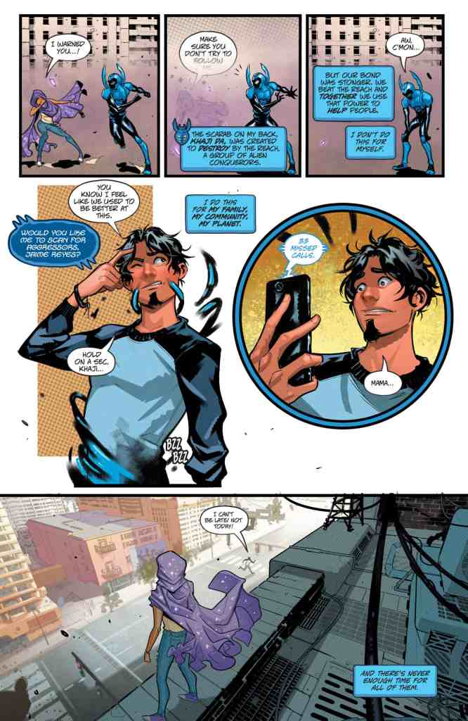 I remember all of my graduations too well and I didn’t have to fight anyone before getting thirty calls from my parents that I’m missing it. But then I’m not bonded to alien technology that lets me fight anyone with a gimmick and criminal intent. Jaime Reyes can, but that’s not really helping him much at the moment. He’s finally graduating high school, but he doesn’t know what to do with himself afterward since all of his friends are heading to college without him. Coupled with the alien scarab on his back is starting to glitch out and other scarab-wearers coming out of nowhere to fight him in the street, he’s having a rough few days. And then the message of a potential invasion from the aliens who created his scarab come in for the whole world to see.