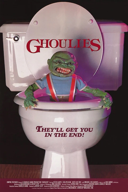 This week’s movie is 1985’s Ghoulies from director Luca Bercovici. When one is the Curator of Schlock, there are certain mountains one must climb in order for you to maintain your credibility. If you look at the poster, you see this goblin thing in overalls popping out of a toilet.