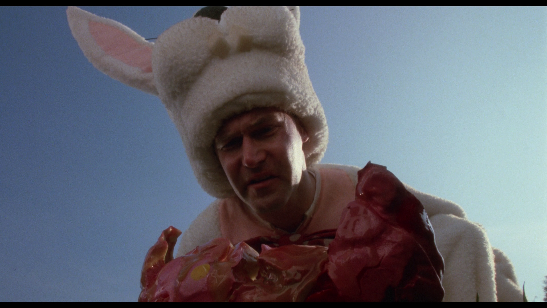 Critter 2: The New Batch features one of the greatest scenes in cinema history. The town sheriff is coaxed into dressing up as the Easter Bunny to greet the kids after the local church service. While investigating the recently hatched Critter eggs, a bunch of Critters jump inside his suit and start munching away. While the local minister is delivering his sermon, the dying sheriff crashes through the church window and falls on the altar. The kids scream at the bloody Easter Bunny in front of them.