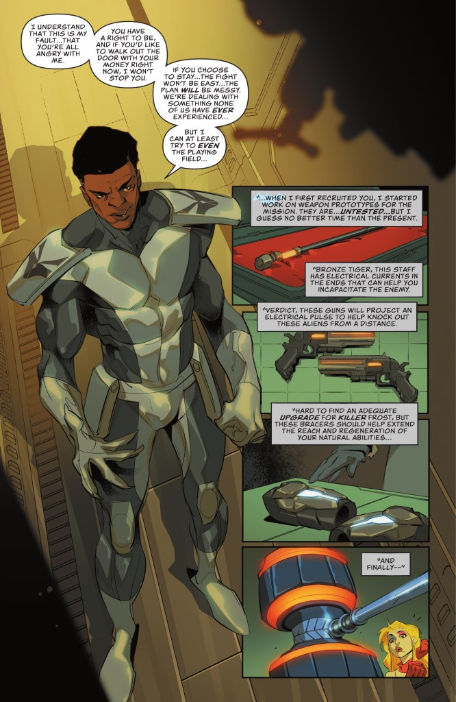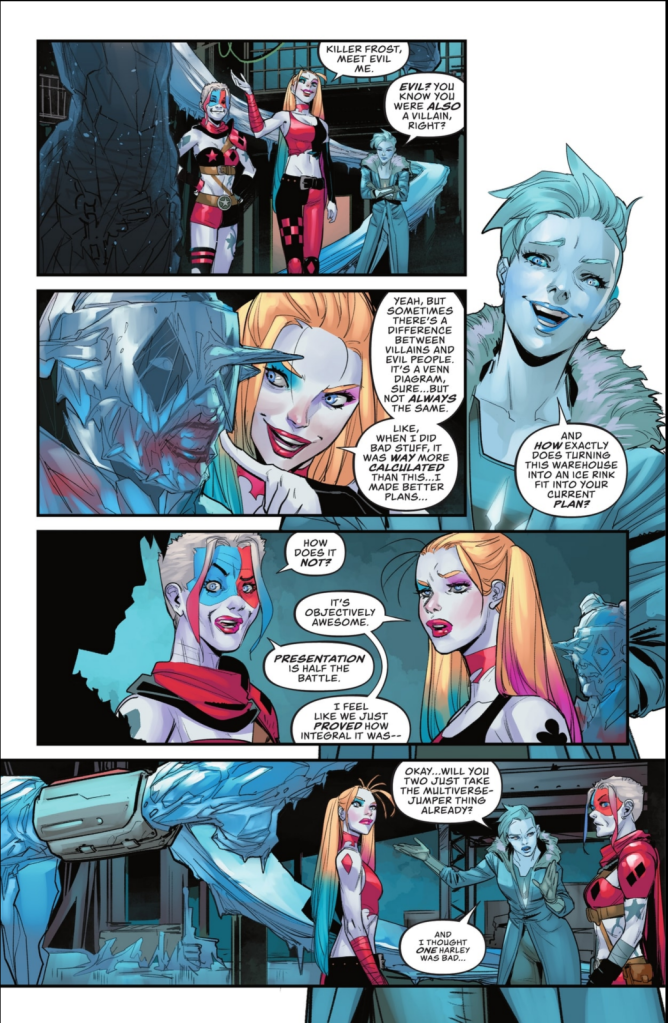 When we last left Harley, things were in a bit of a state. Her, Batwoman, and Kevin had just prevented Verdict from blowing up city hall, but during their celebrations, her prison transport was intercepted by a duo of villains—the same duo that begin this arc chasing Harley down. But the hunting is less for murder and more headhunting—Luke Fox, better known at times as Batwing—needs her for a mission to the moon to retrieve a sample of unstable matter. And of course, because of reasons, this goes horribly wrong before the sapient matter is finally subdued by the team learning to work together. As a reward, Harley heads to Vegas to celebrate and in the process buys a boat, gets shot, dies, gets resurrected, and discovers the Dark Metal iteration of herself hunting down all of the Harleys of the Multiverse. Wasn’t this a Jet Li movie?