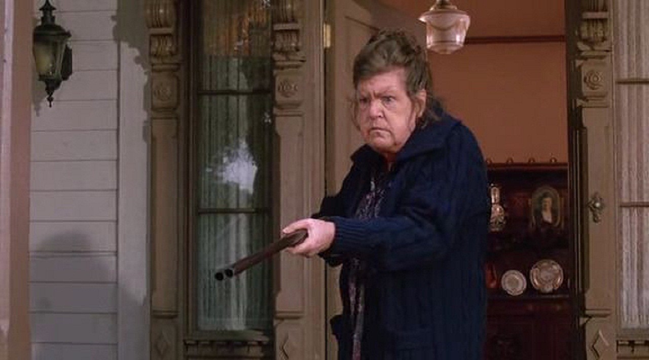 There’s also a beautiful girl next door named Samantha (Kristy Swanson) who takes a shine to our young scientist, but all is not well in the neighborhood. Samantha has a drunk dad named Harrison who likes to slap her around for disobedience whether she’s disobeyed him or not. And then there’s Elvira Parker, a nasty old battleaxe who won’t think twice about anyone that trespasses on her property. And if you’re unfortunate enough to be playing a game of basketball and your ball lands on her property, it’s her ball now.