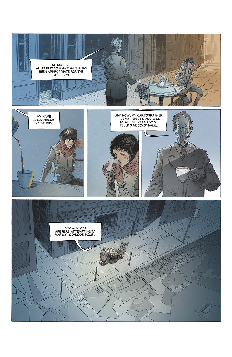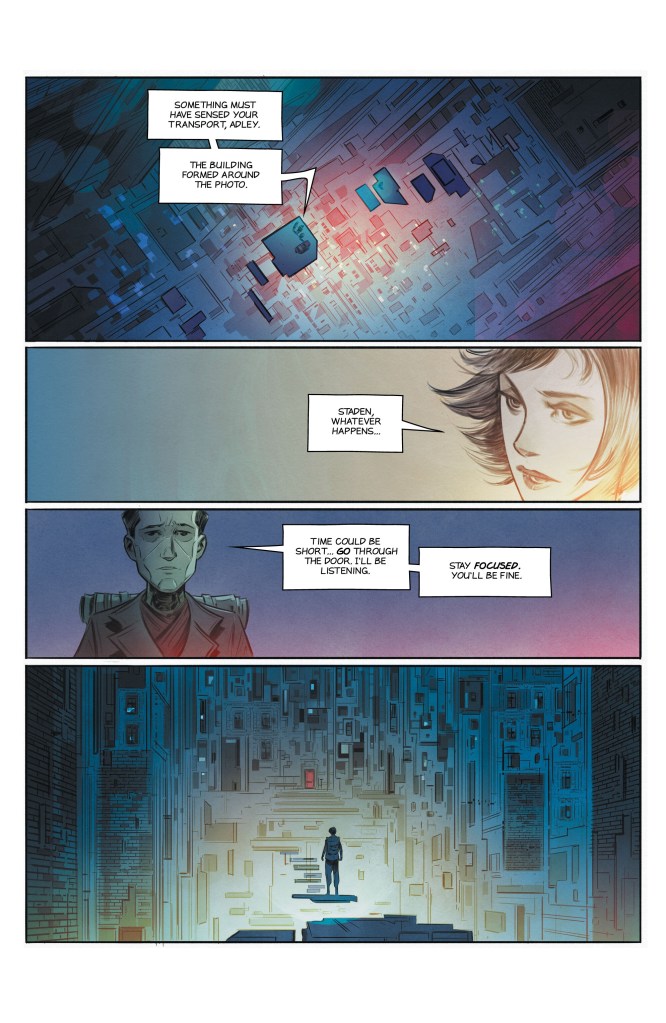 The last time we had looked at this series, Jacob and Elena were lost in a realm known as The Bridge while their daughter, Adley, would dream about where they were. Picking up from there twelve years later, Adley has developed those dreams into the conscious skill to view The Bridge remotely and is training with an android, Staden, to guide him through the shifting landscapes of the extra-dimensional space. As Adley guides Staden through The Bridge to find her parents, he encounters other bots left from previous cartographer expeditions that had disappeared, many from before the first expeditions left Earth. Following the breadcrumbs that Adley can find, Staden reaches deeper into The Bridge as it begins to shift further.