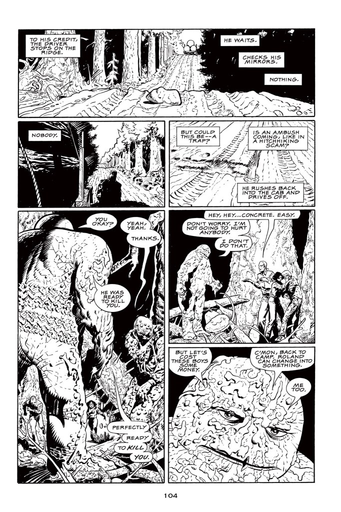 Concrete as a character has been around since 1986 in the first issue of Dark Horse Presents, but this particular story comes ten years later in the form of the fifth short series from Chadwick. But this is the kind of story that is quick to catch up any reader not familiar with the character or his background in just a few pages. Concrete, though, isn’t the kind of character that needs too much in terms of an explaining outside of his brain being put into a concrete body by aliens and his role as a well-known travel writer. It’s why, when Penelope, a member of the Earth First! group, he initially refuses, thinking mainly of his career. A fire changes his plans and mind as Concrete, Penelope, and the rest of her Earth First! troupe travel to the pacific Northwest to save the old growth forests of Hidden Valley, all the while worrying about staying incognito.