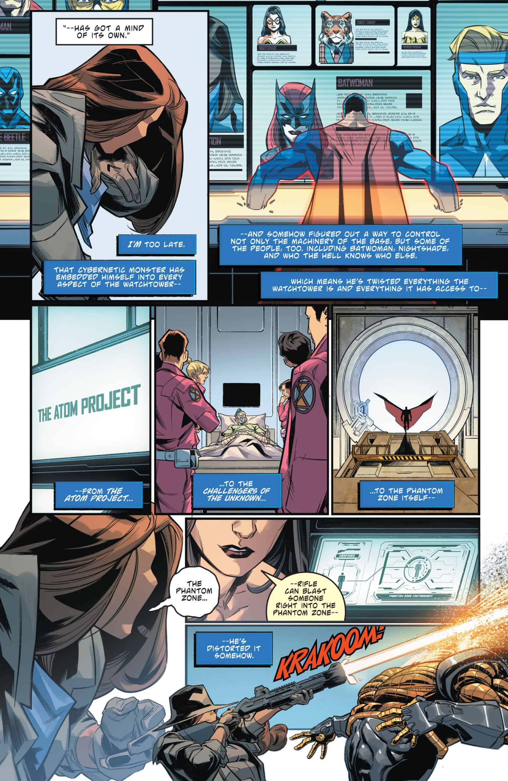 The relationship between Earth and its heroes has changed recently—Absolute Power happened and heroes were sapped of their powers—and the newly minted Justice League Unlimited has built an orbiting watchtower. It acts as both a headquarters and hideout for heroes who may not trust the world below. But there’s an oddness running through the tower that no one can quite explain. Enough strange occurrences pile up that Batman recruits Renee Montoya—our current iteration of The Question—to investigate. Looking for an excuse to leave Gotham, Montoya takes on the new role and there are immediate escalations. A member of the Challengers of the Unknown is found dead in her room, a tiger from the bestiary is let loose, and one of Superman’s strongest foes breaks through security to wreck the tower’s atrium.