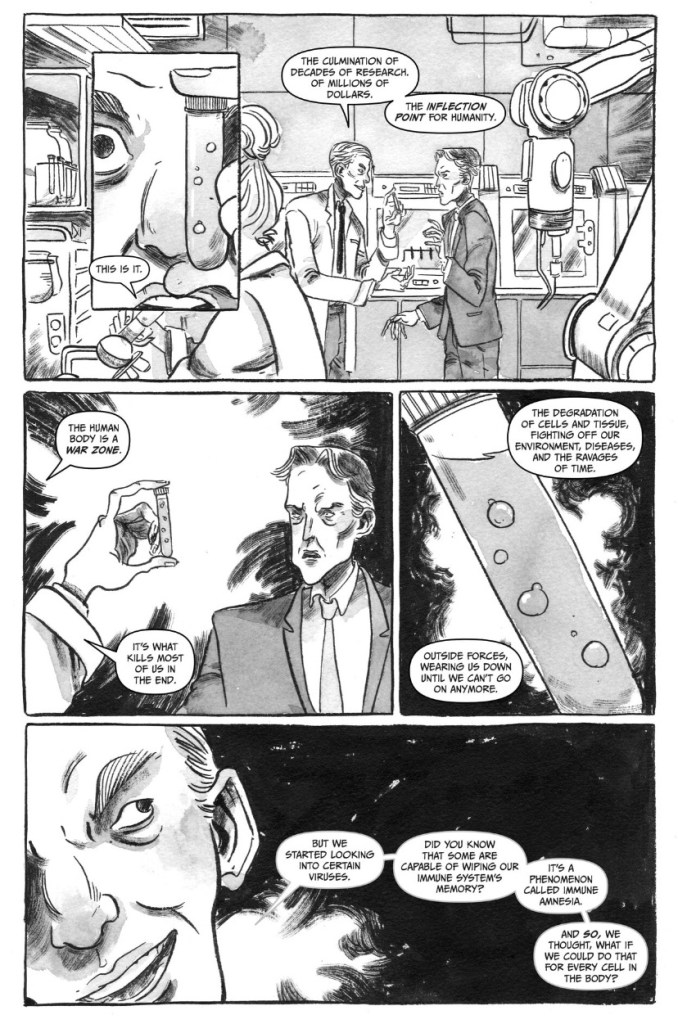 Edward Kane is a multi-billionaire with stomach cancer. He’s spent a sizable portion of his fortune looking not only for a cure for the cancer, but for a cure for everything. Sickness and aging are the two things keeping him from living forever, so why can’t a few billion in research funds help him along the way? Enter the benevolent virus developed in a remote resort that, when infected, will cause the body to simply forget how to age and decay, much in the same way immune amnesia resets our immune system. Kane, much to the chagrin of the researchers who developed the virus, makes himself patient zero. But after recovering from the virus being injected into his system, he enters a world in which all of the people on that remote resort have become blank figures wobbling in the breeze. While the virus can erase disease in the body, when jumping from Kane to anyone else, it’s mutated to erase their very sense of self as well.