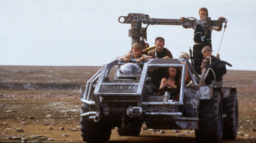 Tonight’s movie is 2000’s Pitch Black from director David Twohy. Yes, this is the first in the Chronicles of Riddick movies, the saga about Richard B. Riddick, an intergalactic outlaw and murderer. Riddick is very good at killing people which has put a huge bounty on his head. He’s being hauled away on a merchant freighter along with settlers, prospectors, and pilgrims. The spaceship is forced to land on an alien planet due to some kind of meteor storm. The ship’s captain is killed during cryosleep. In a moment of panic, the ship’s pilot, Carolyn Fry (Radha Mitchell), wants to eject the passengers so they can safely land, but she is forbidden by the first officer. After the ship crash lands, Fry survives, but the first officer is killed.