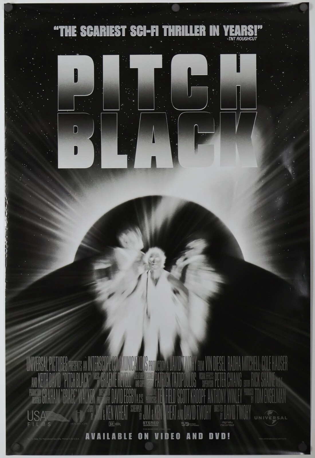 Tonight’s movie is 2000’s Pitch Black from director David Twohy. Yes, this is the first in the Chronicles of Riddick movies, the saga about Richard B. Riddick, an intergalactic outlaw and murderer. Riddick is very good at killing people which has put a huge bounty on his head. He’s being hauled away on a merchant freighter along with settlers, prospectors, and pilgrims. The spaceship is forced to land on an alien planet due to some kind of meteor storm. The ship’s captain is killed during cryosleep. In a moment of panic, the ship’s pilot, Carolyn Fry (Radha Mitchell), wants to eject the passengers so they can safely land, but she is forbidden by the first officer. After the ship crash lands, Fry survives, but the first officer is killed.