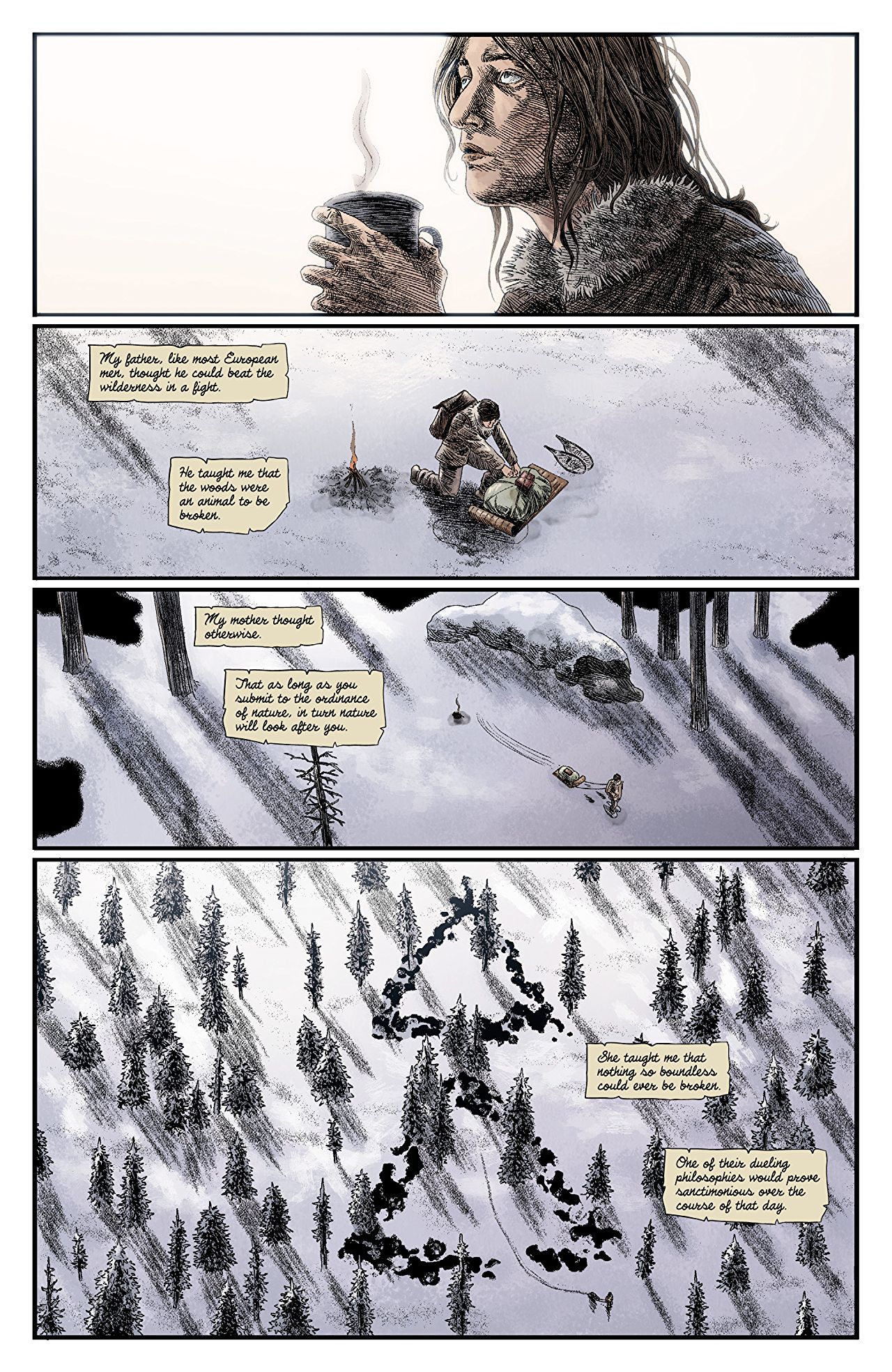 Between the action in the panels and the epistolary narration happening after the fact, there’s a slowness to the narrative that helps to mirror Eulalie’s trudge through a desolate, snow-blasted landscape. And with the pace comes an all-encompassing weight throughout the story as this feeling of dread hangs on every moment. Even when Eulalie reaches the village in the North—always unnamed—it’s not a sense of relief we feel when we arrive. From the panel grids being used to intersperse distant scenes to the full-page moments that give proper weight to Ito-esque horrors happening, everything in the comic serves the purpose of instilling the feeling that something awful is a page-turn from happening. But even in the presence of all that dread, there still remains a sense of hope in the story that Eulalie will somehow make it out of the snow and the woods.