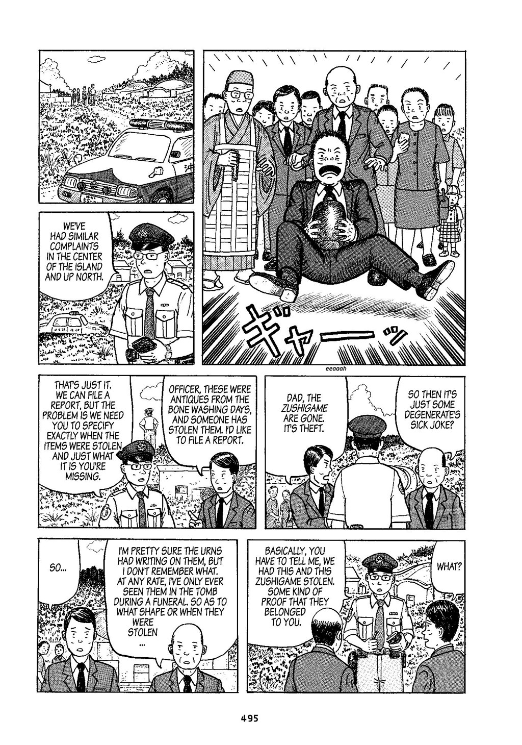 “Mabui” is Okinawan for “spirit” and this idea holds together the various stories that make up this half of the collection—both on the spiritual side and for the Okinawan identity. In this series of stories, we see everything from the military landlords that are paid by the Japanese government to rent their land for US military bases, people whose land is subject to crashed planes and lost pilots, an American soldier who had coached children on how to play baseball during the war returning decades later, grave robbers pilfering whole crypts for their burial zushigame, and a woman who works on one of those military bases stuck between a well-paying job on a military base and her identity as an Okinawan. No matter the story, there is always that connection back to traditional Okinawan religious practices as well as the involvement of a yuta—a spiritual leader—to help solve the character’s problems.