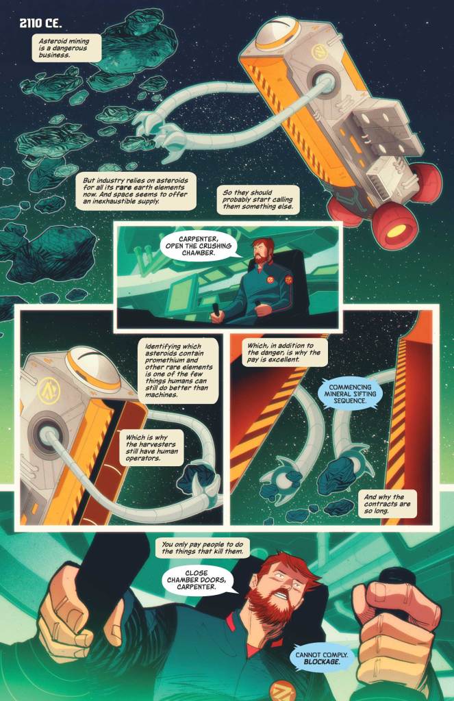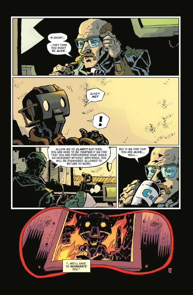 There are ending pages in Vanishing Point that I’m going to be thinking of for years. The set-ups lend themselves so well to these single-issue stories that going any further would bloat them beyond the impact they’re looking to make. Just the conceit of the fourth issue, “Proof of Life,” shows us that a story about a robot gaining sapience doesn’t have to become that robot struggling to stay alive. It can instead be a test from the other robots that have also gained sapience to see if this unit is ready for the truth about their existence: that they exist to finish building a Dyson sphere and need the imagination that comes with self-awareness to complete it. But there exists in the series hope and horror in equal measure. The fifth issue gives us radical therapy to convince someone to stop their suicidal ideation by putting them into a scenario where they’re faced with death. But it’s not to convince them to live. They just want to keep the person alive long enough to make a spectacle of their execution.