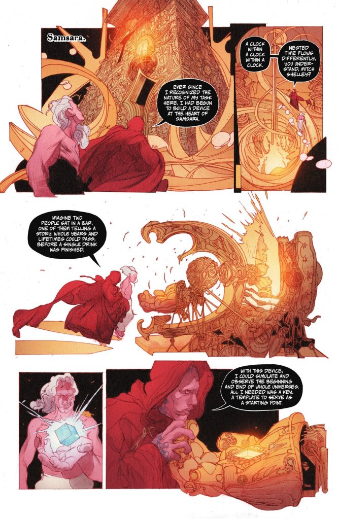 But maybe that isn’t actually Mitch Shelley. Maybe that’s Mathieu Salliere. Or maybe it’s Michael Sheldon, or Mark Seivers, or any other combination of names. And what happens when he dies of old age instead of in some climactic fight? It’s here that he sees those names he’s taken on before. The different lives that he’s lived. When he can roll through time in his mind, he can change bits and pieces to put things in place just enough to hopefully keep something great and terrible from devouring our universe.