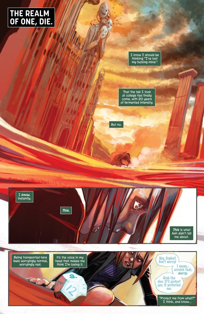 The last time I looked at DIE, we broke down some of the basics of the world: the table-top role playing game nature of the world, the classes the characters inhabit, and how they’ve come to this place. But what we have in this first issue is the group a year after they had exited the world of DIE and are getting back to relative normal. Ash is a father now while his partner, Sophie, has been dealing with being a single mother since he’s been gone while the rest of party are dealing with the lives they had left behind before Covid—fun to escape a deadly RPG world and then immediately be put into Covid lock-downs. The party, though, has reconvened to an extent at Chuck’s memorial service where they have all been left gifts from Chuck—likely something concocted in his will as he had died in DIE. While Ash receives a little figurine from Chuck, Sophie is given a die. A die from DIE. A die that brings her to the world that Ash had only just escaped.