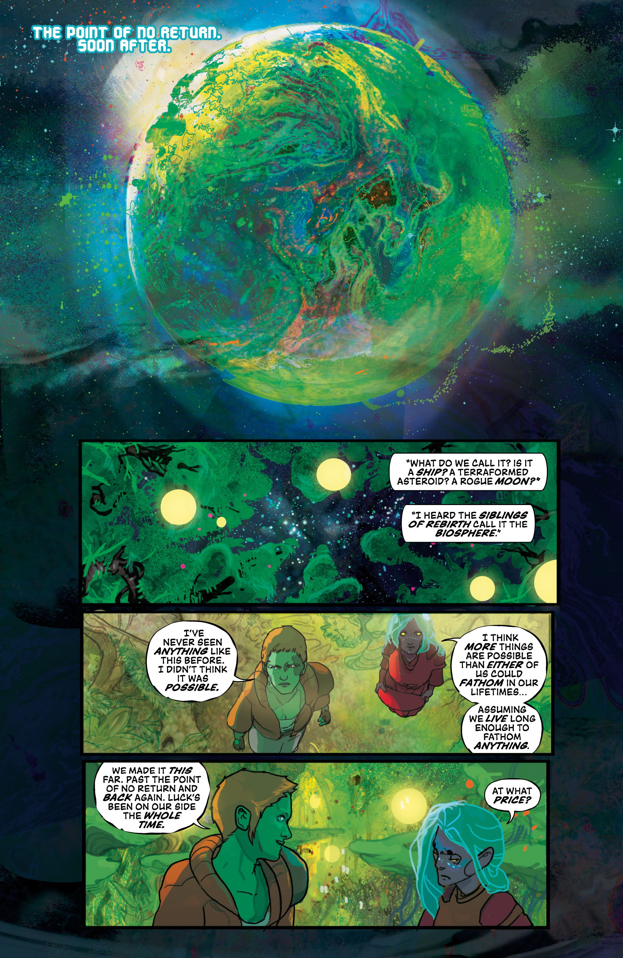 From where we last left off, the crew of the Sundog was on the run from both the company Lux and the church of Renunciation and found themselves on the edge of space, ready to be taken in by a rogue sect of Nones that had renounced the Renunciation. On a planet that may be a ship despite having its own biome, Grix and Vess can’t decide what their future should be. Or, rather, Vess has made her decision to stay with the Siblings of Rebirth on their mobile planet while Grix is free to do what she wishes. And what she wishes is to leave this planet after the Nones there use some kind of power within it to destroy a massive Lux warehouse. More than anything, Grix wants to escape the cycle of violence she finds herself in, even if that means leaving Vess behind.