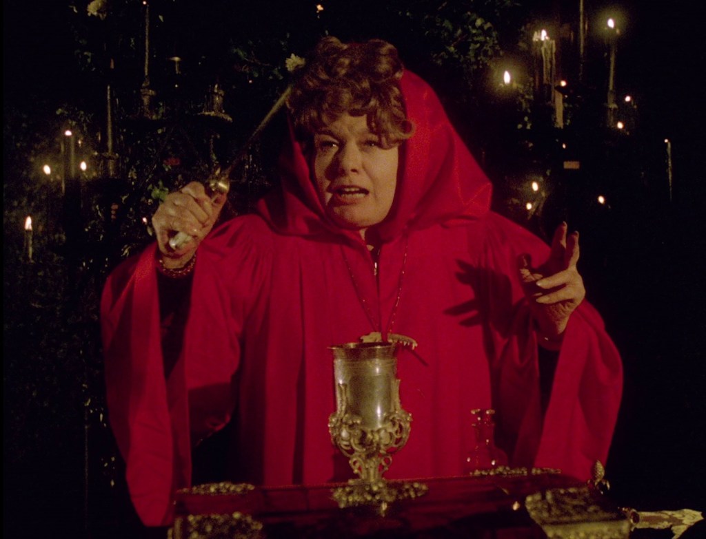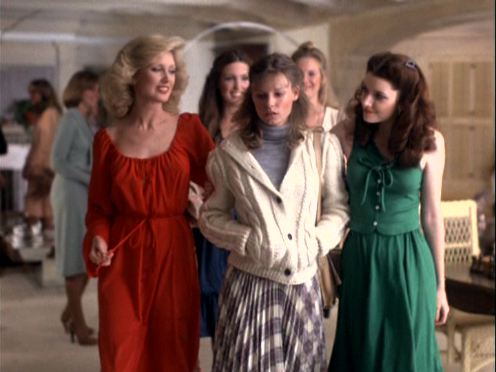 Alpha Nu Sigma is run by a bunch of catty bullies, the president of which is Jennifer Lawrence (Morgan Fairchild). Patty, naturally, gets accepted into Alpha Nu Sigma while Sarah has to settle for Phi Epsilon Delta. Sarah’s new sorority is the main rival of Alpha Nu Sigma and run by the mysterious house mother Erica Hunter (Shelley Winters). Erica has been working on her thesis for ages and is rumored to have performed witchcraft. I also have a sneaking suspicion that she’s the birth mother of Patty as she and Sarah’s father seemed to have a fling back in her college days.